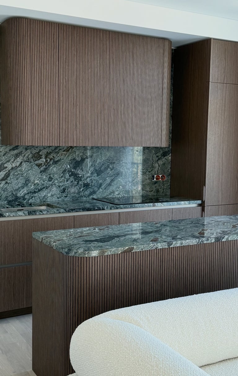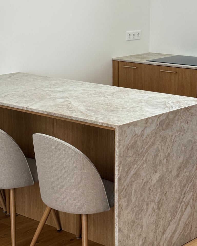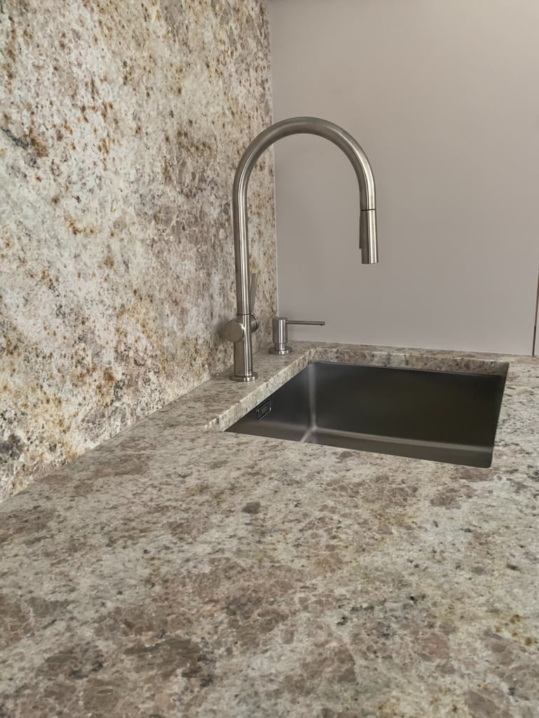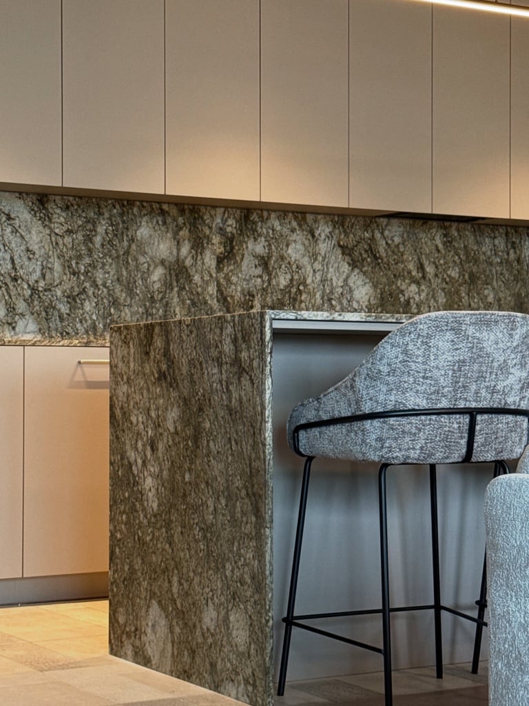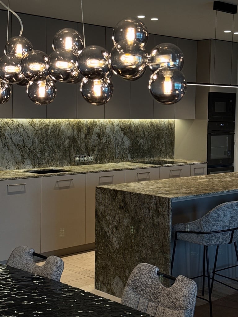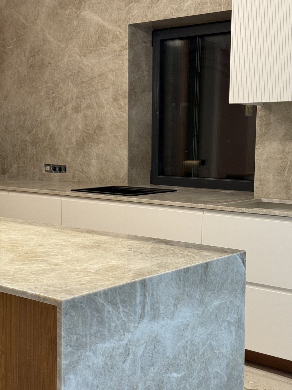 Elegancija ir unikalumas: natūralūs akmens raštai bei plati spalvų paletė leidžia sukurti unikalų virtuvės ar vonios akcentą.