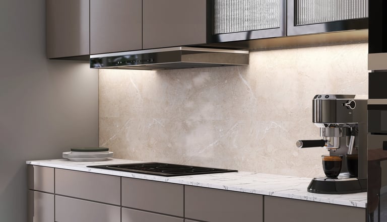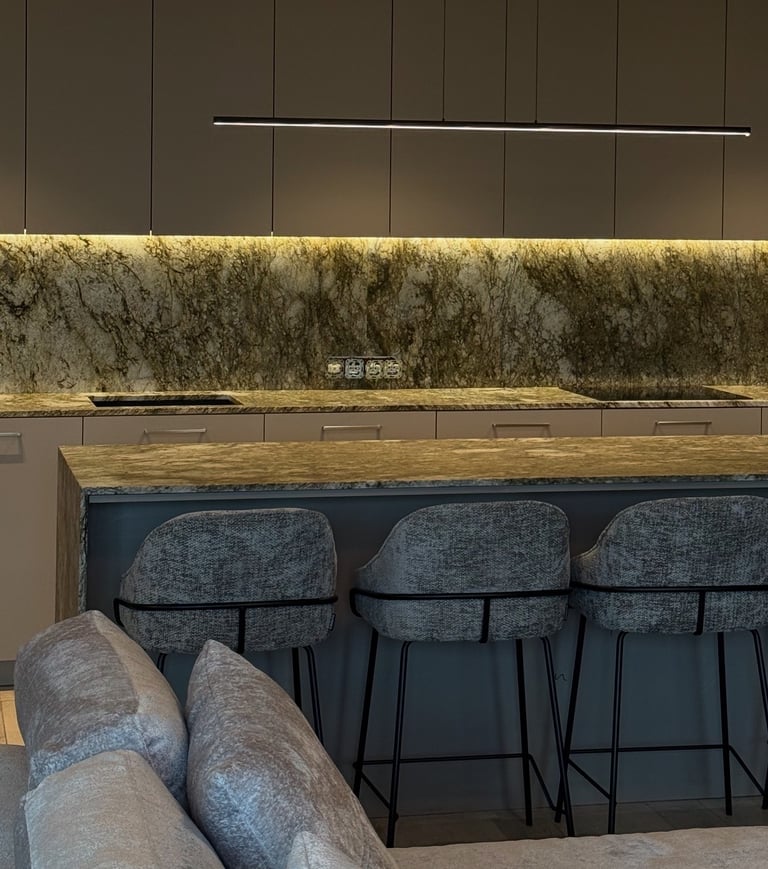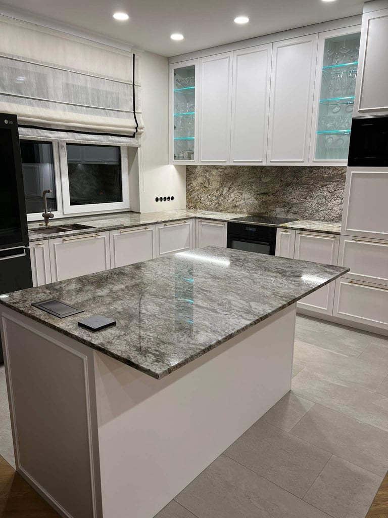 Elegancija ir unikalumas: natūralūs akmens raštai bei plati spalvų paletė leidžia sukurti unikalų virtuvės ar vonios akcentą.